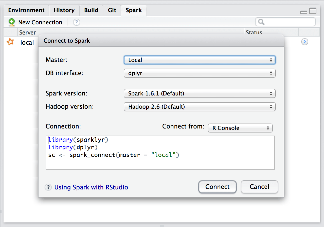 Once you’ve installed the sparklyr package, you should find a new Spark pane within the IDE. This pane includes a New Connection dialog which can be used to make connections to local or remote Spark instances: