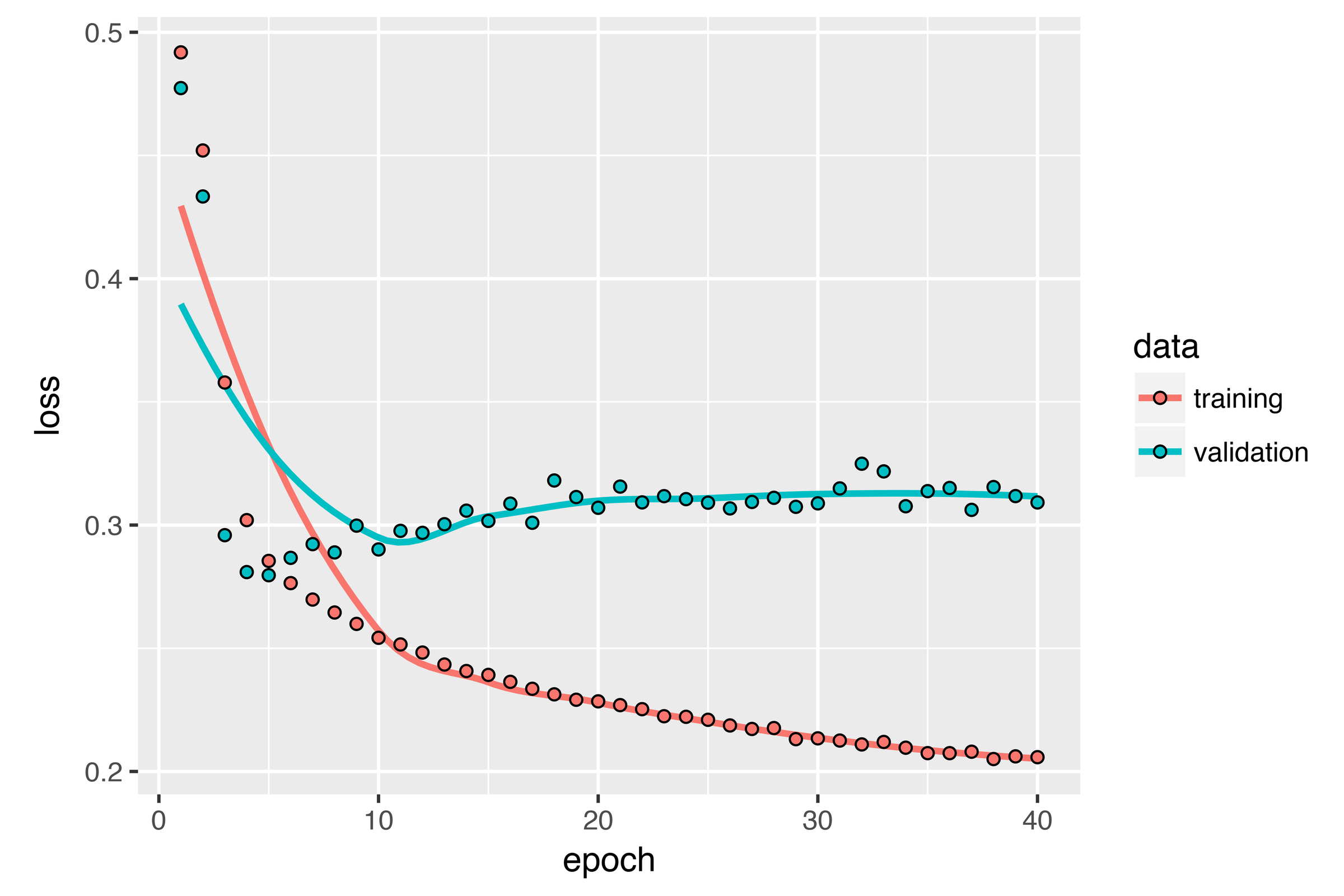 The plot below shows the results. Success! You’re no longer overfitting during the first 20 epochs. But although you have more stable evaluation scores, your best scores aren’t much lower than they were previously.