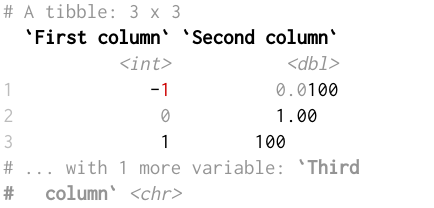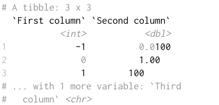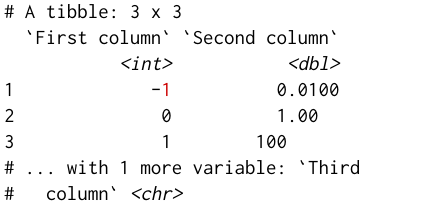 We’re excited to announce version 1.4.2 of the tibble package, a minor update focusing mostly on display and performance. This is a small release designed to address the biggest issues introduced in version 1.4.1. We’ve introduced a number of option to give you greater control over the appearance, and tweaked the default to work better for more people. (The option names start with pillar, because that’s the package that is actually responsible for printing; the new options are available with pillar 1.1.0 which will be installed automatically when you install or upgrade tibble.) In addition, tibbles are now displayed faster, even very wide ones. The subsetting performance has also improved.
