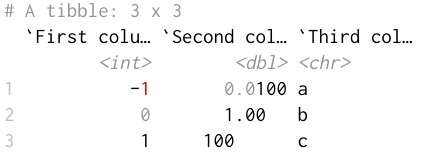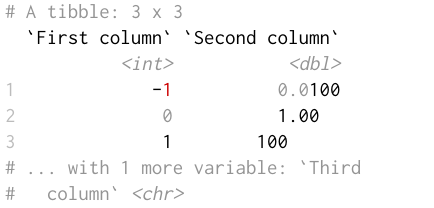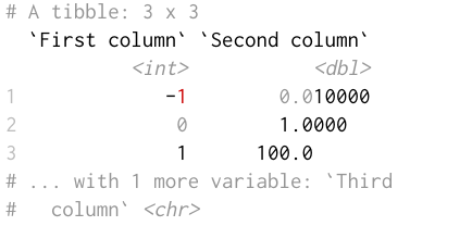 pillar.neg: Highlight negative numbers? Default:TRUE, the output foroptions(pillar.neg = FALSE)is shown below.