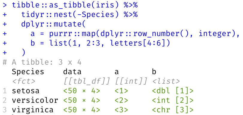 #> # A tibble: 3 x 2 #> a b #> <int> <list> #> 1 1 <dbl [1]> #> 2 2 <int [2]> #> 3 3 <chr [3]>