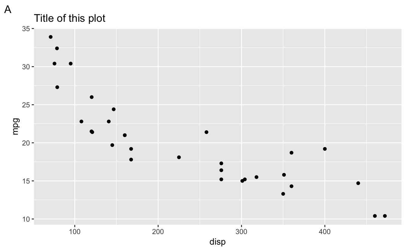 In addition to title, subtitle, and caption, a new tag label has been added, for identifying plots. Add a tag with labs(tag = "A"), style it with the plot.tag theme element, and control position with the plot.tag.position theme.