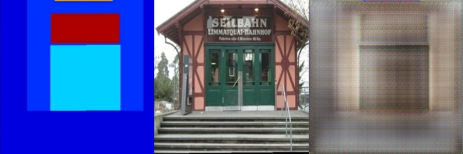 For an extreme example, take this. The mask leaves an enormous lot of freedom, while the target image is a pretty untypical (perhaps the most untypical) pick from the test set. The outcome is a structure that could represent a building, or part of a building, of specific texture and color shades.