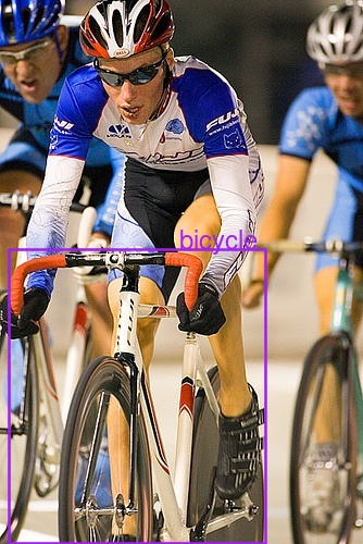 After 8 epochs, IOU on both training and test sets is around 0.35. This number doesn’t look too good. To learn more about how training went, we need to see some predictions. Here’s a convenience function that displays an image, the ground truth box of the most salient object (as defined above), and if given, class and bounding box predictions.
