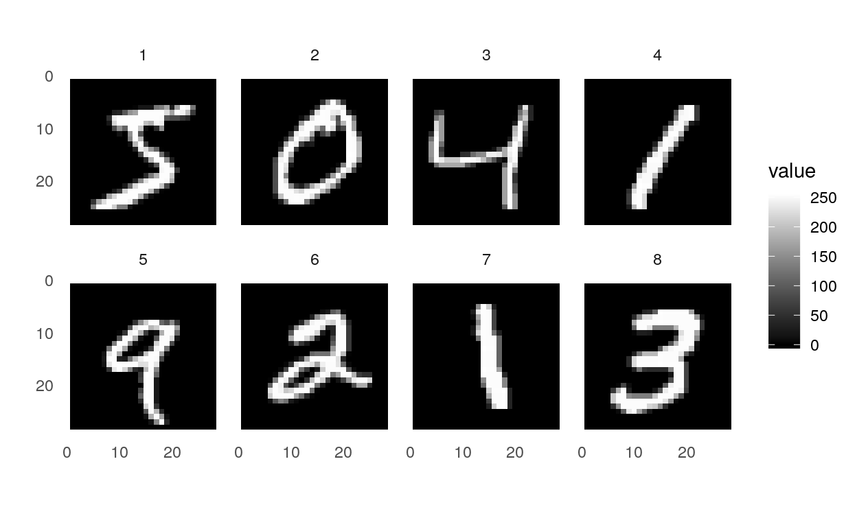 The x data is a 3-d array (images,width,height) of grayscale integer values ranging between 0 to 255.