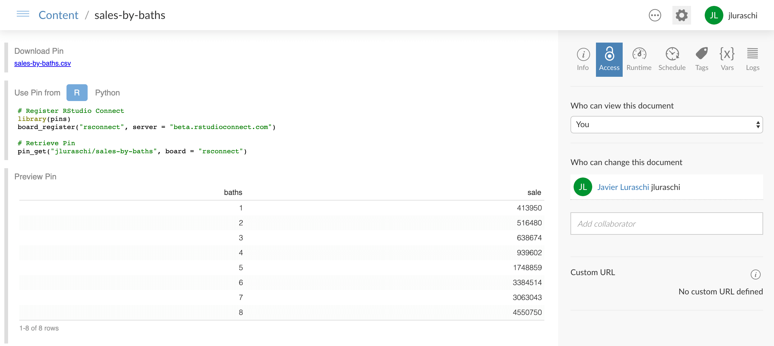 pin("sales-by-baths", board = "rsconnect")After a pin is published, you can then browse to the pin’s content from the RStudio Connect web interface.