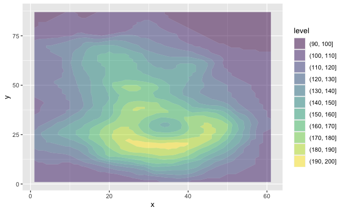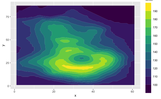 There is so much wrong going on here that we won’t go through it. In any case, this is all in the past because ggplot2 has moved on to using the new isoband package and now provides a geom for filled contours specifically: