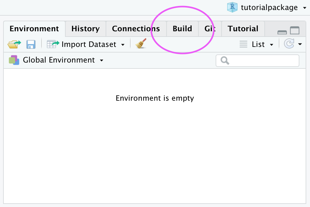 A second session of RStudio will open – this session has a Build tab in the pane which also has the tabs Environment, History, etc. This tab is specific for building packages, and we will use it later. You can close the first RStudio instance.