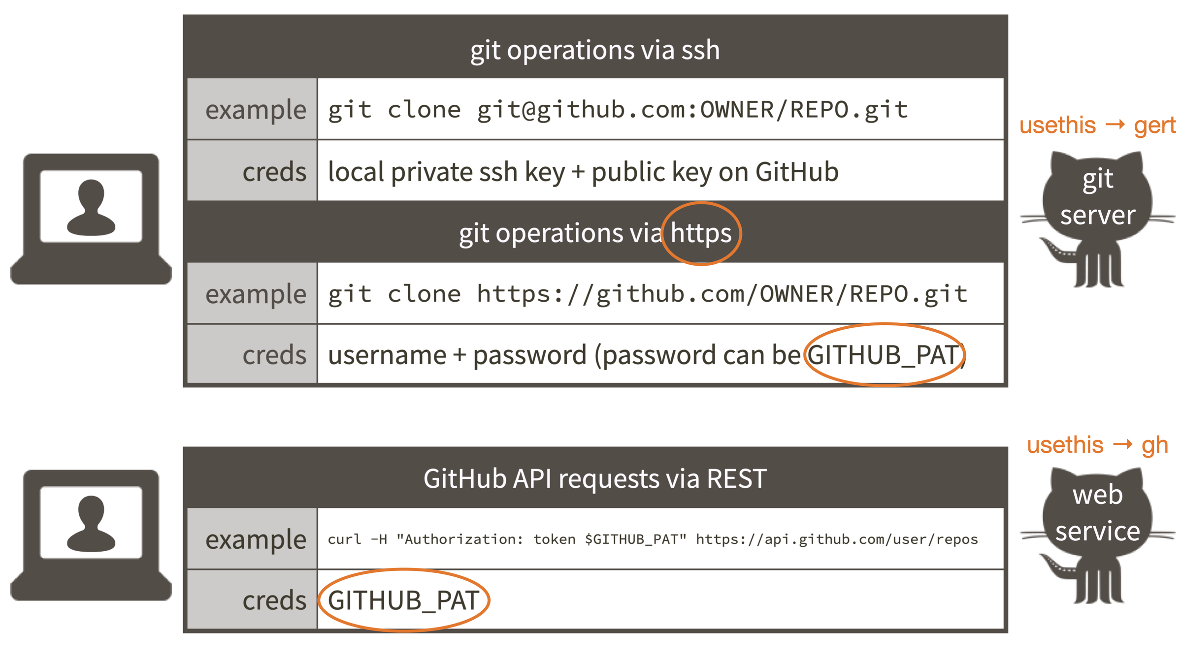 The cheerful orange ovals indicate why we recommend HTTPS as your Git protocol: Once you set up your GitHub personal access token (PAT), usethis, gert, and gh (and possibly other packages) will all be able to find and use this common credential. (If you are an SSH person, you need to set up a GitHub PAT for work that involves the GitHub API, in addition to the SSH keys needed for Git work.)