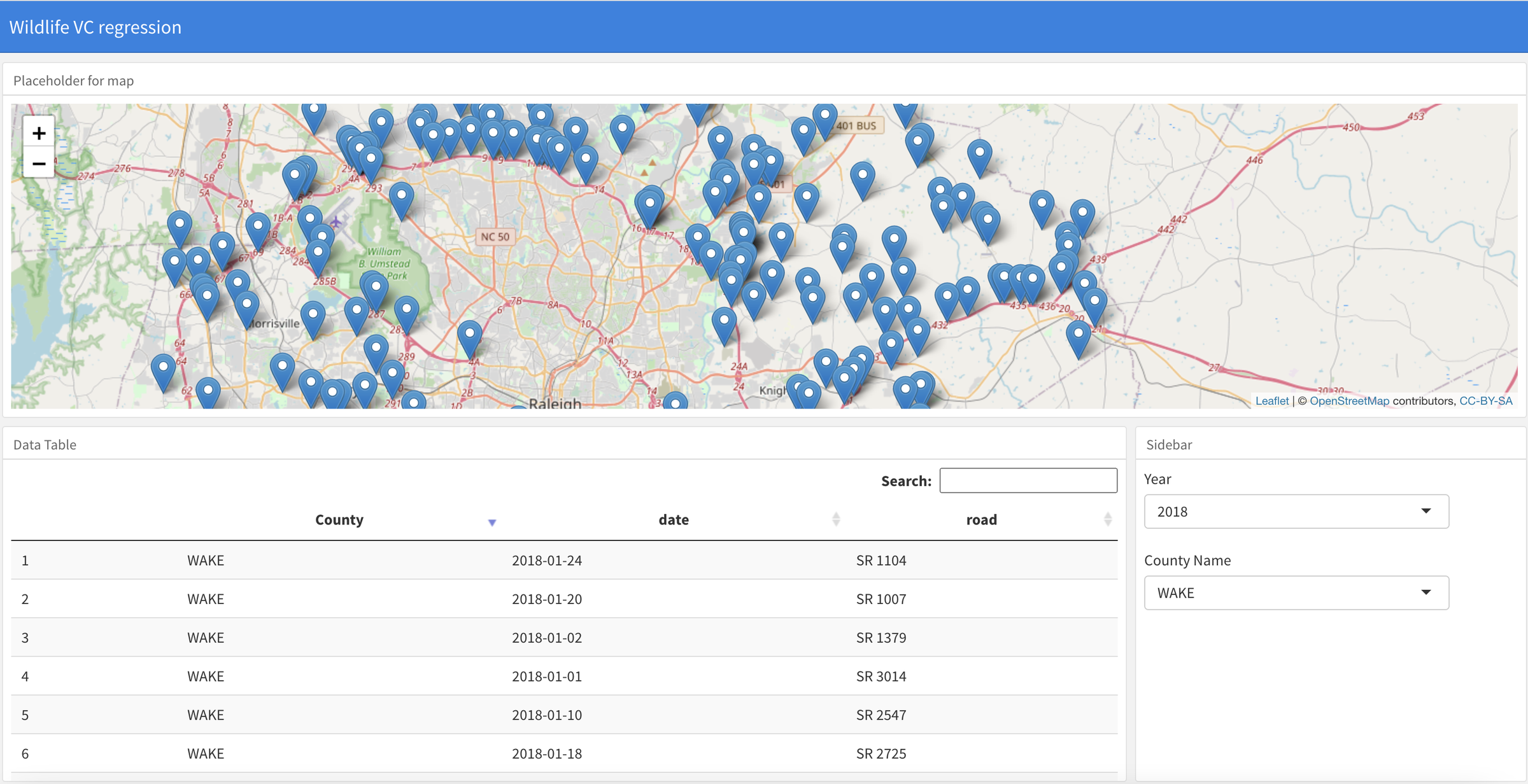In the fall semester of 2020, RStudio piloted a program to provide mentorship to Black, Latinx, and Indigenous students in data science. I had the opportunity to participate in this program, and used it to focus on learning and developing my skills with R. Over the course of three months I worked closely with Janeka Handford of RStudio, who went the extra mile ensuring that I not only reached the goals outlined via the mentorship but also gained a much deeper understanding of R coding processes in general. Through our combined efforts, I was able to build a small interactive shiny app that explored the geographic data of wildlife-vehicle collisions in North Carolina between 2014 - 2018. With the shiny app dashboard, we were able to sort our data by county and year allowing for specificity. Shiny has really shown me how vast amounts of data can be easily filtered and used in geographic visualizations, and how much fun it can be to learn by building.