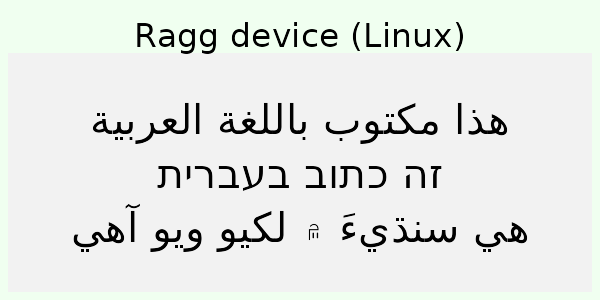 If you’re not familiar with the languages above it can be hard to see what is right and what is wrong. You may, however, look at how the text in the code is rendered in the browser and compare that to the device rendering. If you do that, you can see that the Hebrew script is rendered in the wrong direction for all the non-ragg devices (except Cairo on Linux). For the Arabic and Sindhi it’s even harder to see what’s wrong because the text looks fundamentally different. That’s because both Arabic and Sindhi rely extensively on text substitution rules and ligatures; the way a letter is written depends critically on what letters it is next to. Still, by comparing to the browser rendering you can see that the same devices failing on the Hebrew script fail here as well.