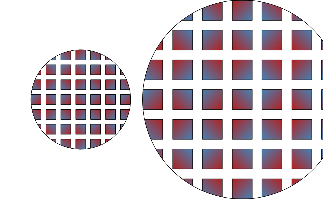 As we see, we are just defining a larger (empty) region from our rect grob, effectively adding more space between each rectangle, rather than creating larger rectangles. This also means that the pattern scales with the grob: