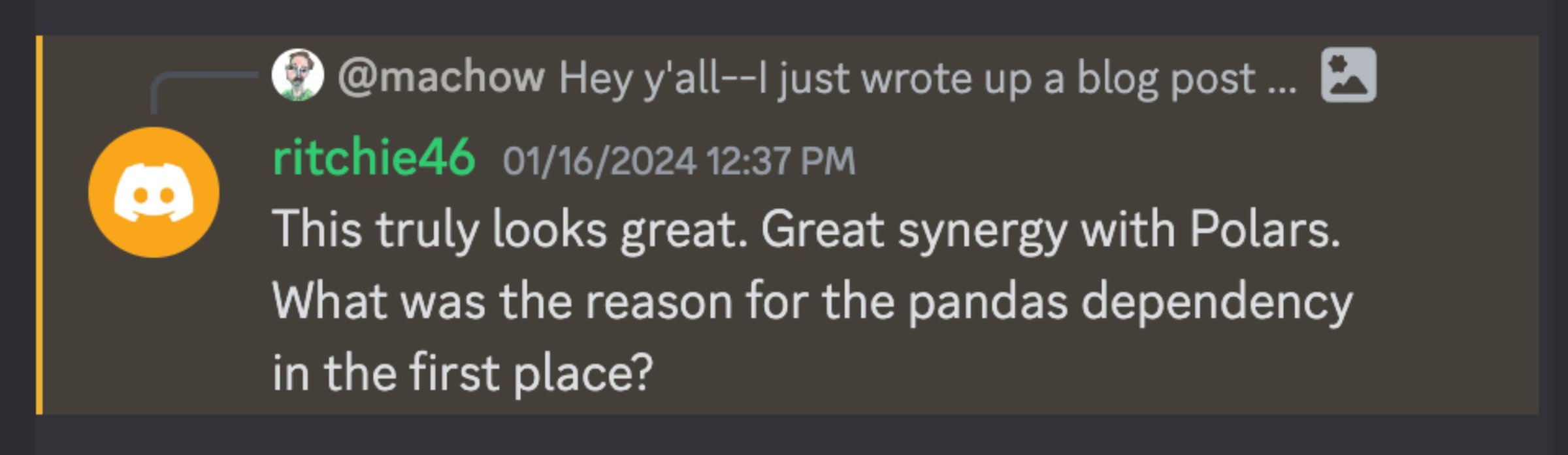 Curious in what folks thought, we dropped it in the Polars discord, and got some Great Feedback: