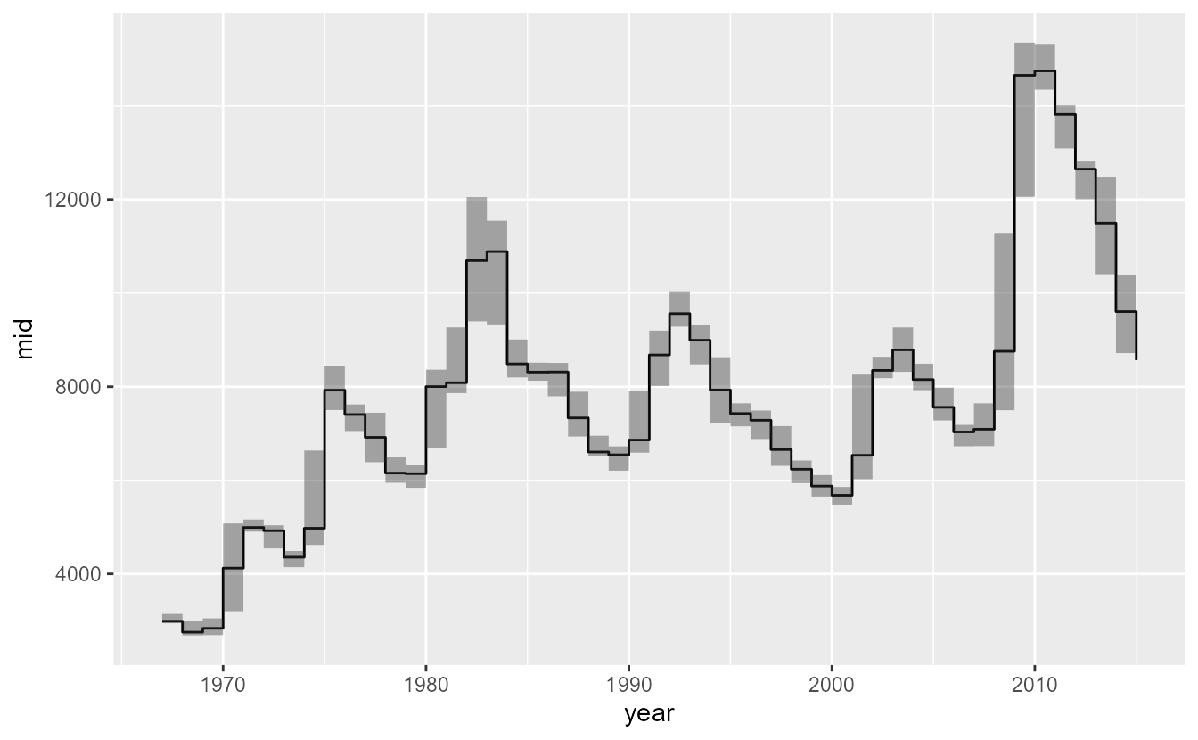 ggplot(eco, aes(year, y = mid, ymin = min, ymax = max)) +