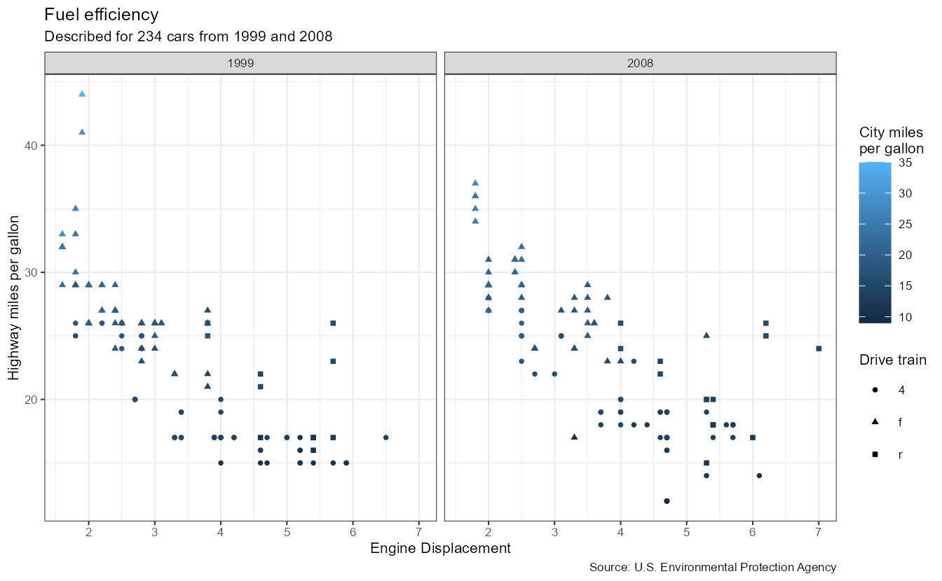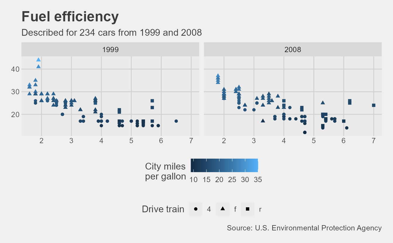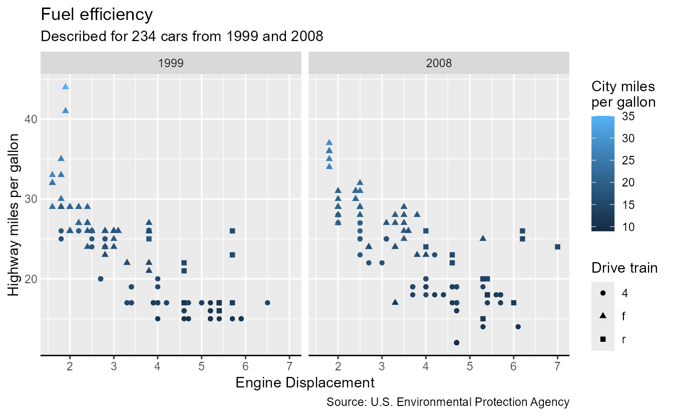 p <- ggplot(mpg, aes(displ, hwy, colour = cty, shape = drv)) +
