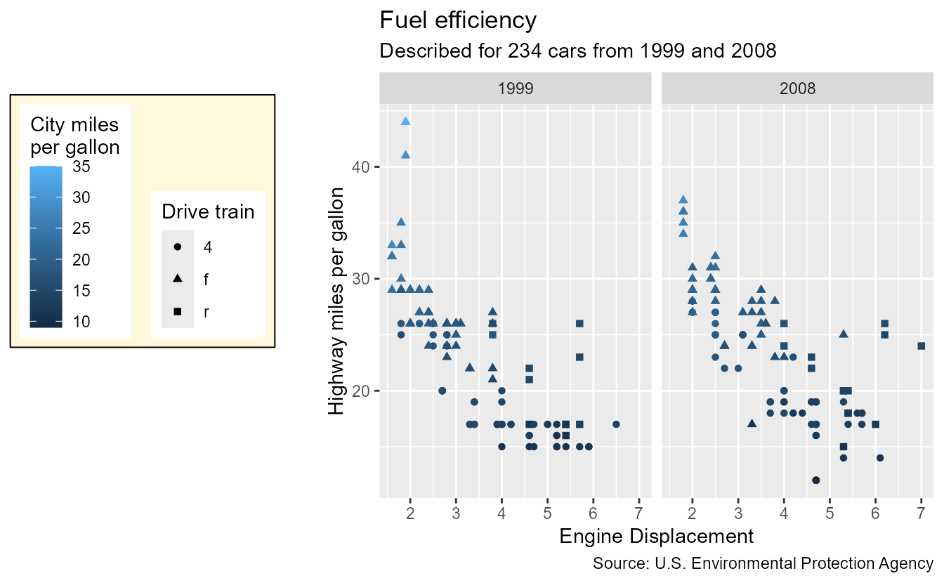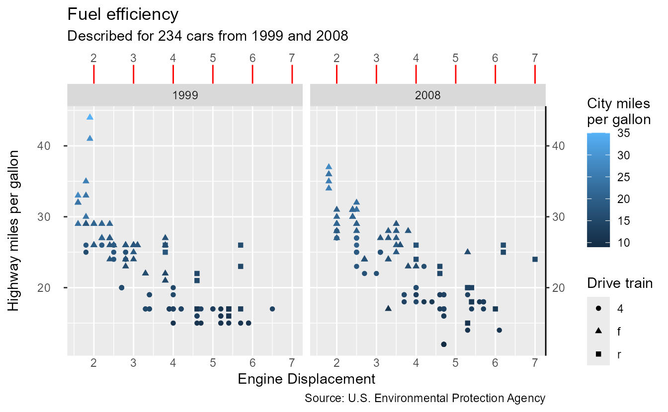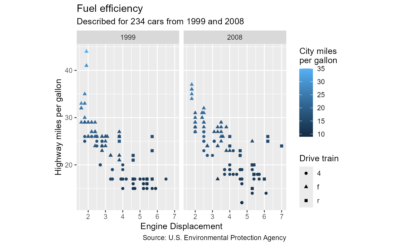 p <- ggplot(mpg, aes(displ, hwy, colour = cty, shape = drv)) +